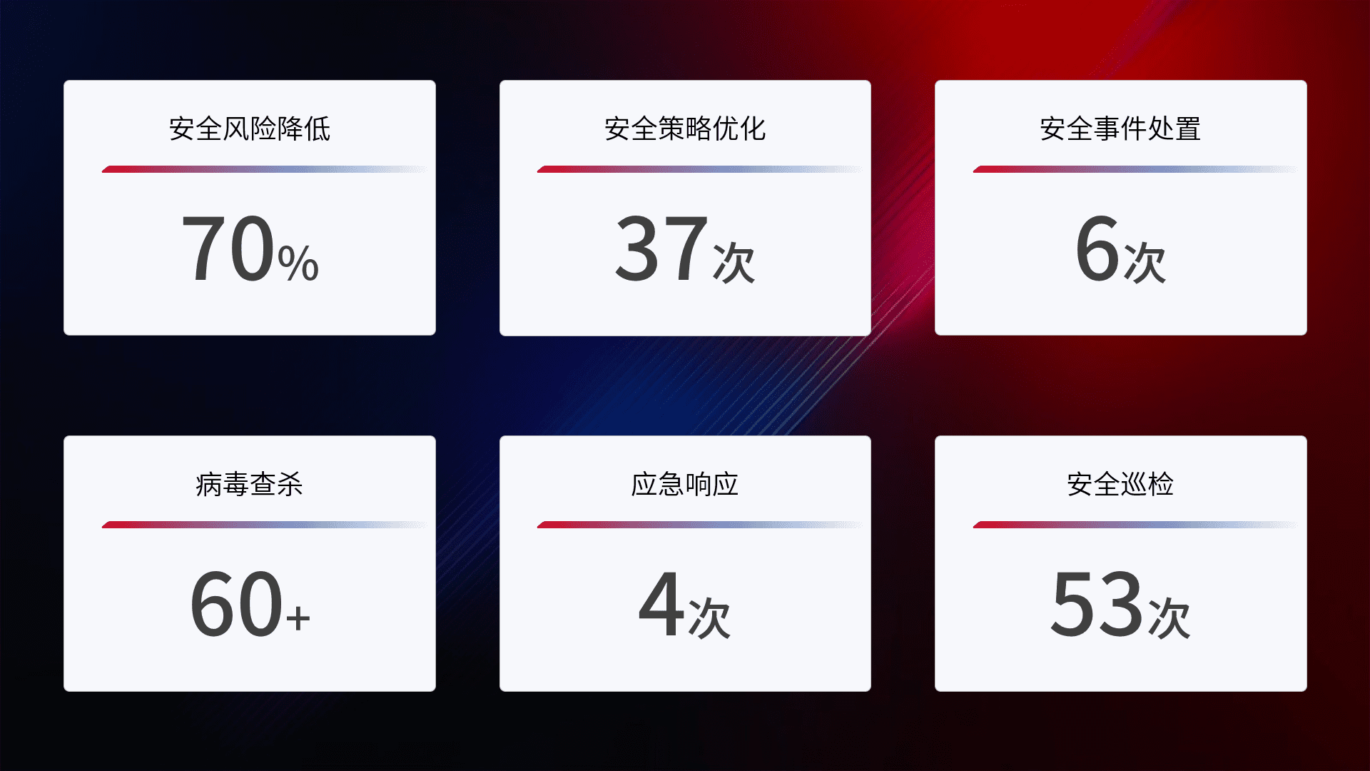 提供全面的安全事件报告体系,,,包括处置报告、、、周报、、季度和年度总结,,,,结合持续监控,,帮助客户深入了解网络安全状况。。