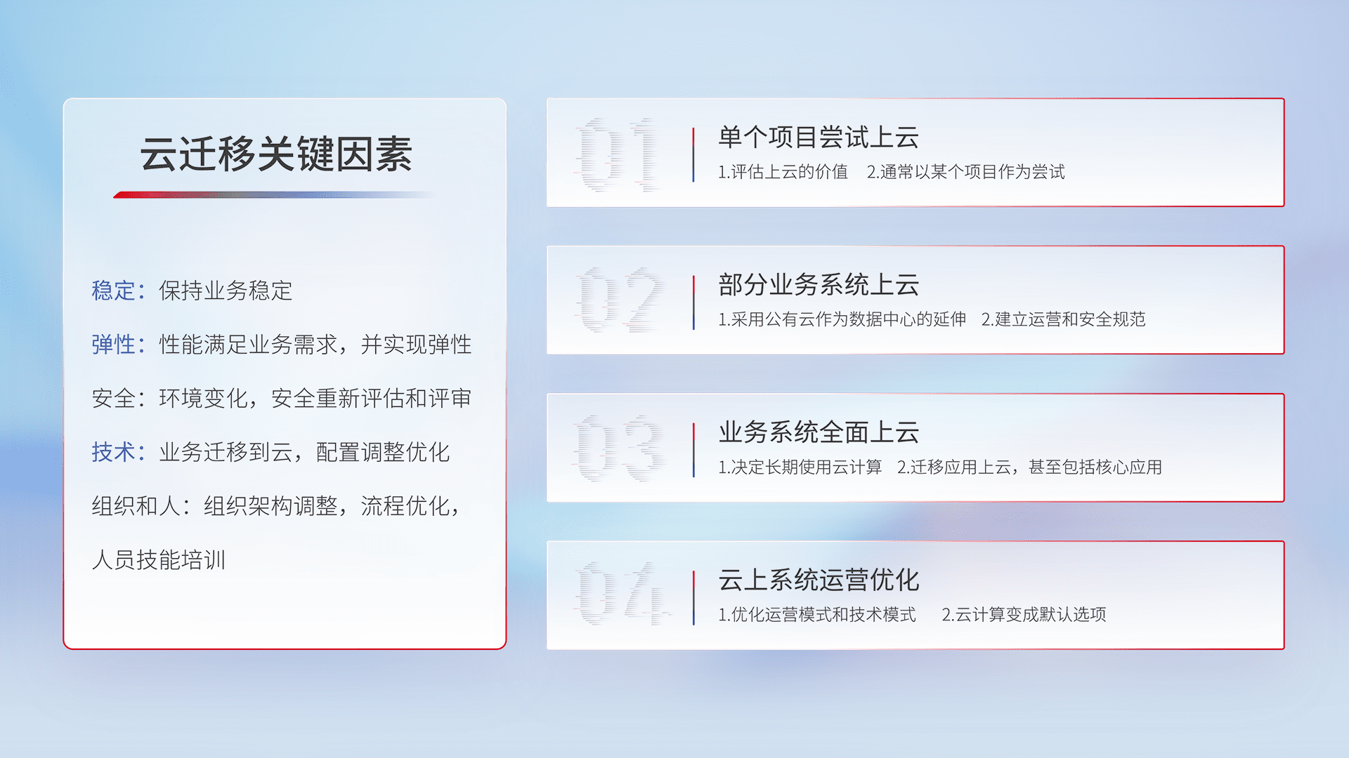 结合实际业务,,从规划设计、、云平台选型、、云原生改造、、、数据迁移、、集成交付,,,迁移全过程为客户识别最佳上云路径,,,,做好风险识别管理,,,设计网络架构、、、、身份权限、、安全审计合规、、、、操作审计、、、日志审计、、监控告警策略、、、、多站点容灾设计等,,对云上基础设施进行整体规划,,,,提升IT治理水平,,,以满足弹性、、高可用、、、高性能的需求。。