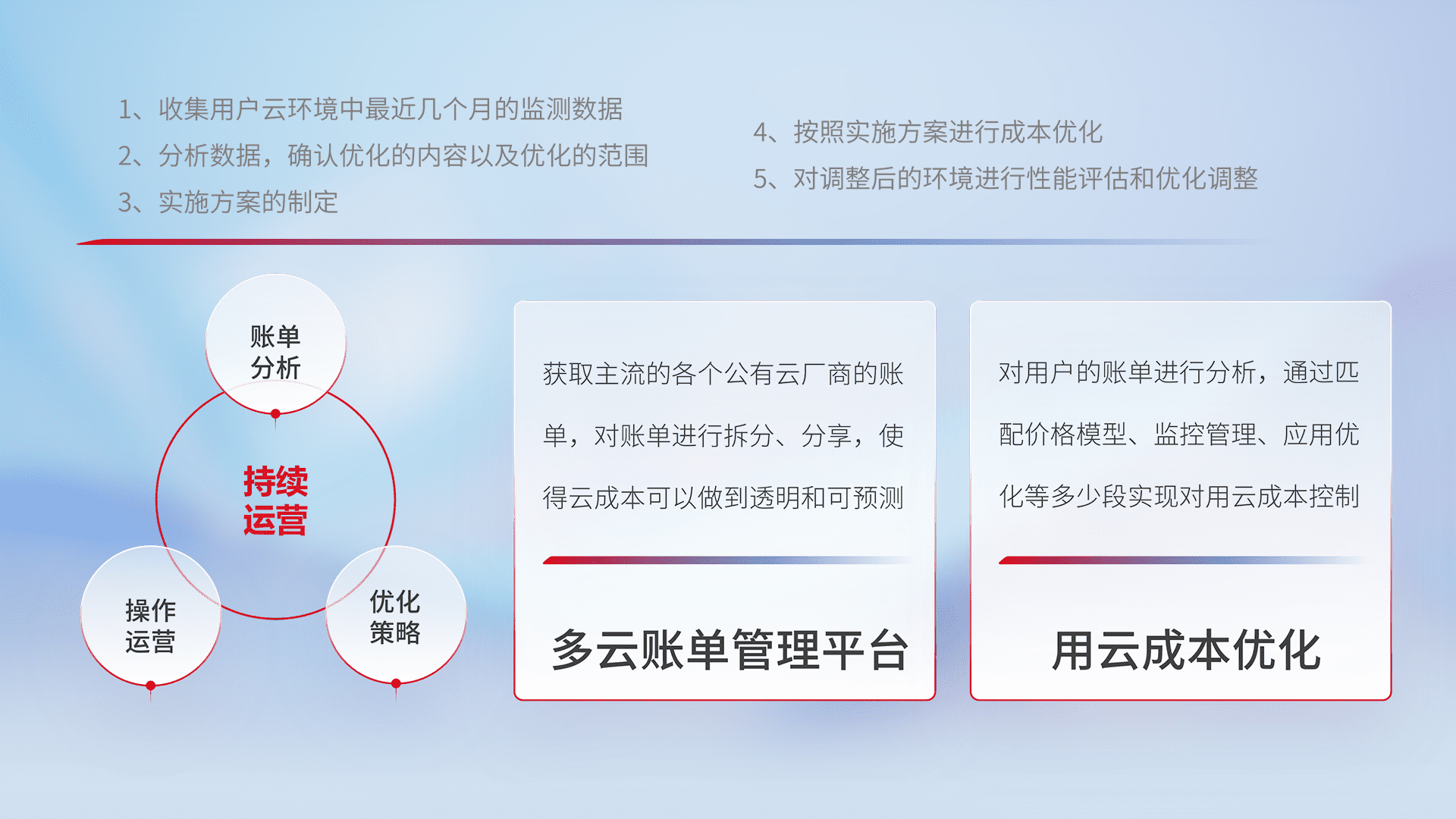 通过多云纳管,,,以统一的资源数据模型把客户的云资源进行抽象和封装,,,,进而实现对多云资源的统一操作,,,保障云资源管理的可靠性、、、稳定性与可用性。。。。量身定制化运维内容,,配置、、、、开发运维、、补丁管理、、、、备份、、、、监控、、认证和访问管理、、、审计和日常巡检等,,,保障在用云过程中的可靠度,,稳定度以及高可用率。。。